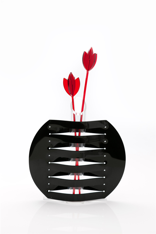 Inspirado no peixe de mesmo nome, o vaso Arraia utiliza as propriedades moldáveis do acrílico para criar uma trama simples e delicada.