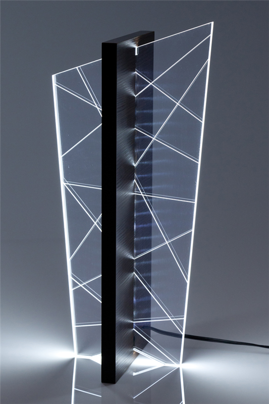Em Lumina, o ateliê explora a fusão entre o LED, o acrílico e a madeira para produzir luminárias de grande efeito visual, como a luminária de mesa Veneta Estaiada I, também vencedora do House & Gift de Design 2012.