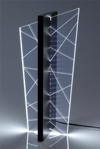 Explorando a combinação de acrílico, LED e MDF, a luminária proporciona iluminação suave e de efeito cênico, perfeita para criar uma atmosfera intimista. A forma é uma alusão à verticalização da paisagem das cidades.