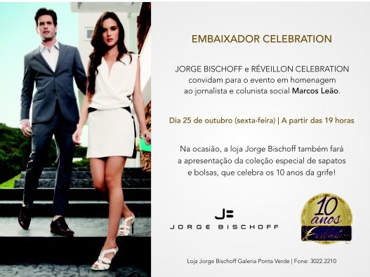 Em parceria luxo, a grife de sapatos Jorge Bischoff receberá na próxima sexta, dia 25, em sua loja na Galeria Ponta Verde, toda a equipe do Réveillon Celebration e convidados para o início das comemorações de 10 anos da festa que mudou o conceito de Ano Novo em Maceió. Escolhido um dos “Embaixadores Celebration”, o colunista Marcos Leão será o anfitrião da noite que, a partir das 19 horas, reunirá uma turma VIP em torno de muito espumante e diversas delícias.