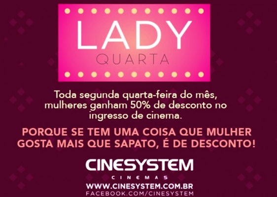 A criatividade em promoções é uma marca registrada da Rede Cinesystem Cinemas. E as mulheres têm um espaço especial. Toda segunda quarta-feira do mês é dia de “Lady Quarta” em todas as 90 salas dos multiplex da Rede no país.