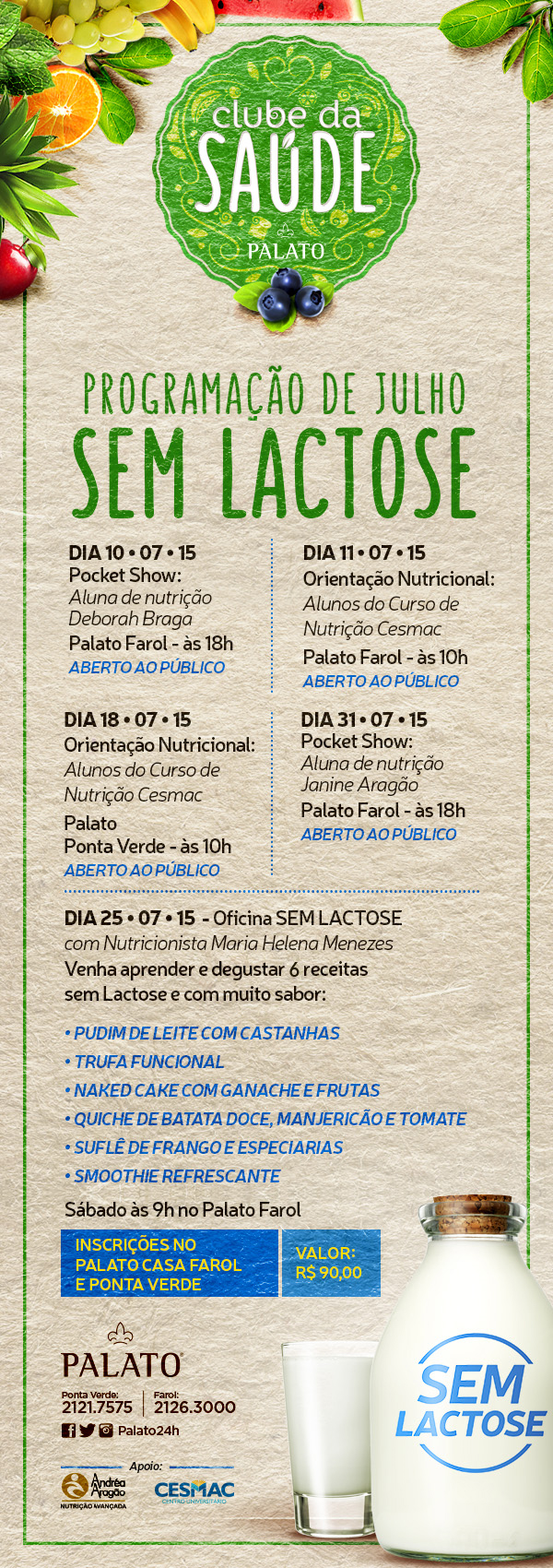Além disso, dois Pocket Shows gratuitos com receitas rápidas sem lactose serão realizados no Palato Farol nos dias 10 e 31 de julho, às 18 horas, comandados respectivamente pelas alunas de Nutrição Deborah Braga e Janine Aragão.