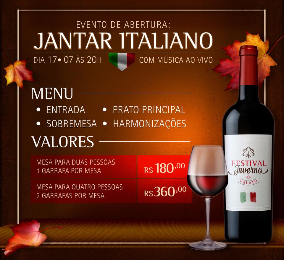 Um jantar temático com cardápio internacional e clima aconchegante ao som de um trio de cordas marcam o início da programação do Festival de Inverno do Palato, na próxima sexta-feira (17). Com menu especialmente desenvolvido para combinar com os rótulos que serão apresentados, os clientes vão poder saborear pratos inspirados na tradicional culinária italiana, como a bruschetta a Matriciana, o filleto de manteiga de gorgonzola, polenta com crosta cremosa de funghi e natas, além de um delicioso tiramissú de sobremesa. Para completar a harmonização, serão servidos o vinho Bellosguardo Chianti e os espumantes Villa Sandi Rose e Prosecco Villa Sandi II Fresco. As vagas são limitadas e as inscrições podem ser realizadas no Palato Casa Farol ou Ponta Verde.