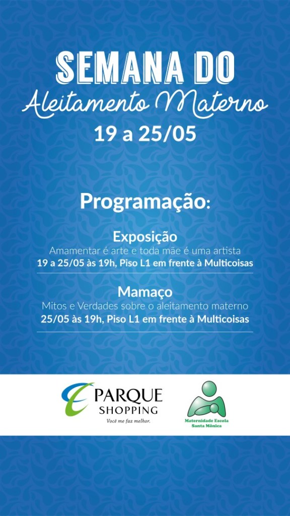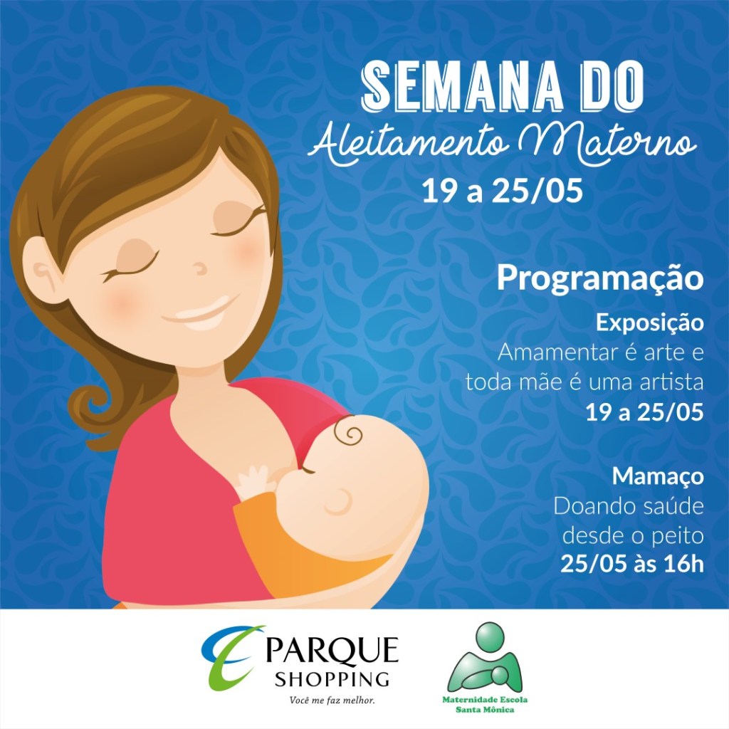 O aleitamento materno e a importância da doação de leite será tema da 1ª Mostra Santa Mônica de Trabalhos Manuais Amamentar, no Parque Shopping. De 19 a 25 de maio, a mostra traz peças de artistas que retratam a causa e profissionais do Banco de Leite da maternidade disponíveis para falar sobre o tema da campanha. Além disso, no dia 25, encerrando a programação, um grande “mamaço” promete tomar conta do shopping a partir das 16h.