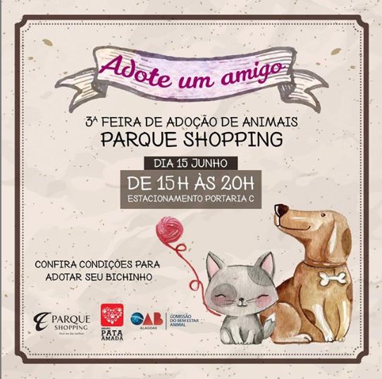 Encontrar um lar para os bichinhos abandonados: esse é o objetivo da 3ª feirinha de adoção de animais no Parque Shopping. Em parceria com o grupo Pata Amada de Proteção Animal, cerca de 40 cães e gatos estarão disponíveis para adoção responsável neste sábado (15), no estacionamento da entrada C, das 15h às 20h.