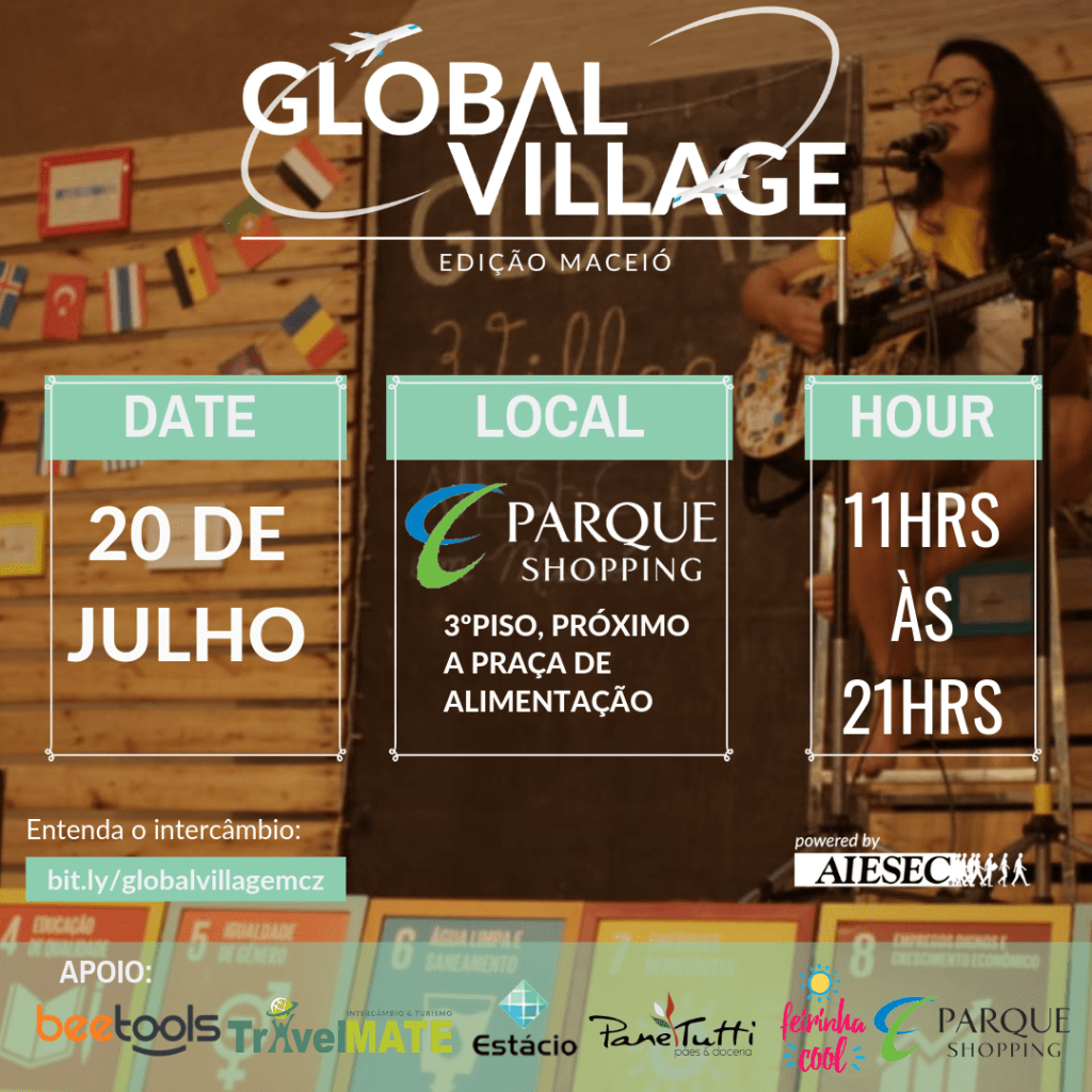 Conhecer um novo país e ainda ter a chance de realizar um intercâmbio repleto de novas experiências? Essa é a proposta que a Global Village apresenta neste sábado (20) no Parque Shopping. A feira cultural irá trazer jovens intercambistas de dez países como Reino Unido, Argentina, Colômbia, México e Lituânia a partir de 11h, no Piso L3 (próximo à Preçolândia).